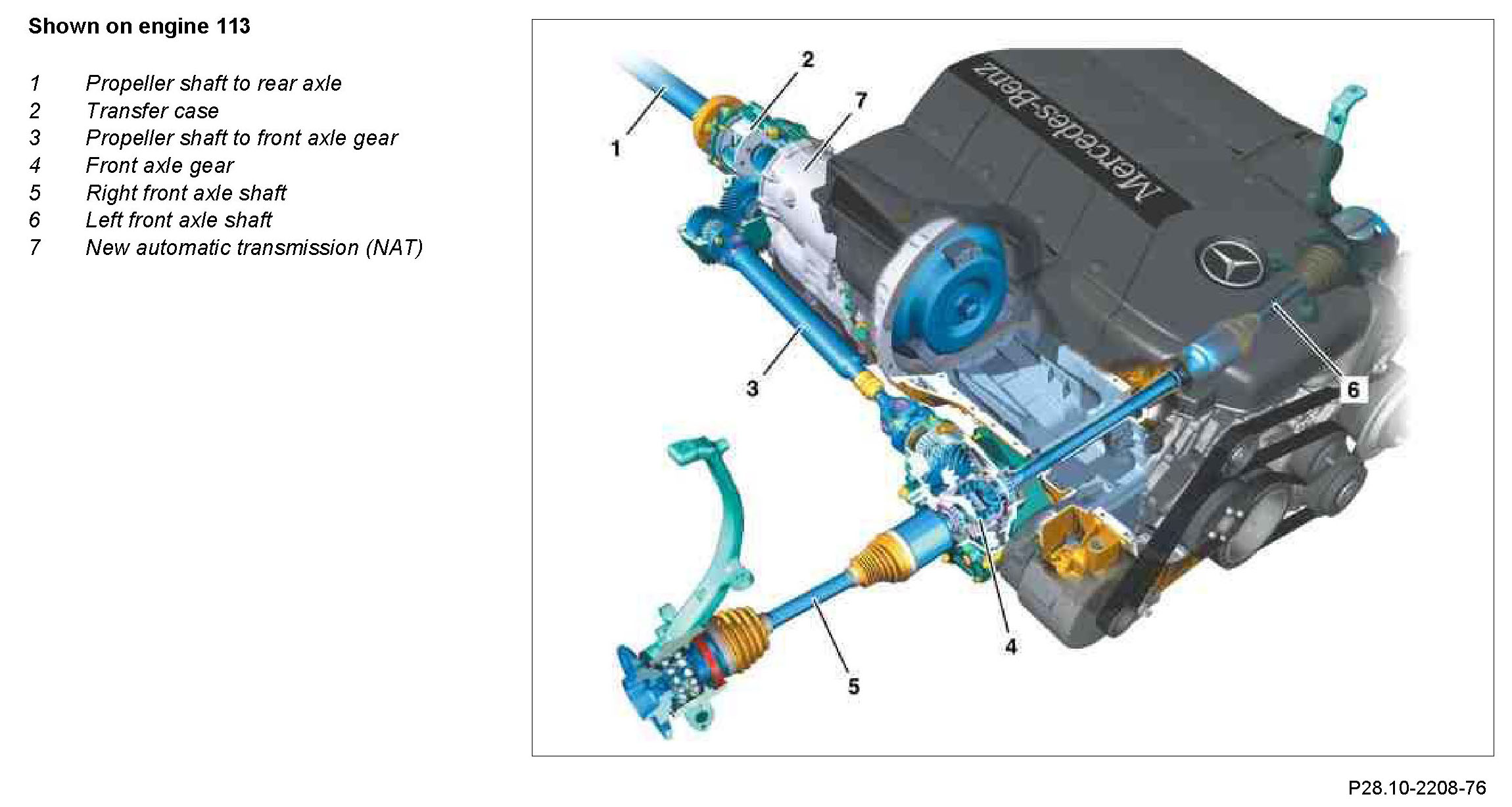 Vehicles with 4MATIC feature permanent all-wheel drive. The drive torque is distributed to the drive axles via a one-stage transfer case (2) without off-road ratio.