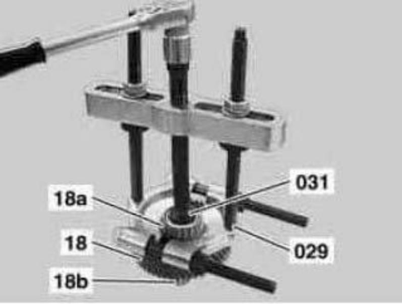 2. Pull tapered roller bearing (18a) and tapered roller bearing (18b) off intermediate gear (18) using puller (029).