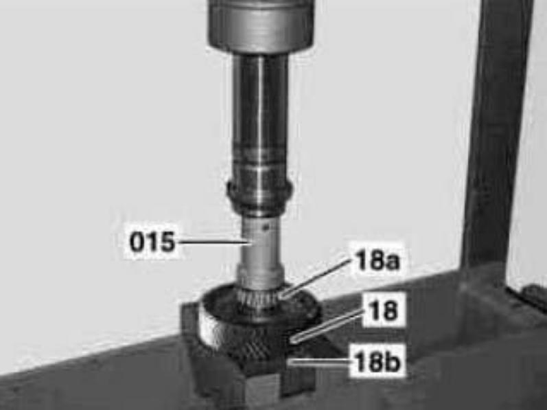 3. Press tapered roller bearing (18a) and tapered roller bearing (18b) onto intermediate gear (18) using drift (015).