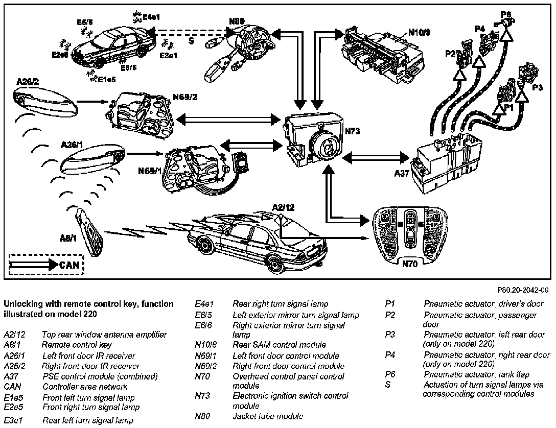 When the "Unlock vehicle" button is pressed once, the remote control key sends a radio frequency and infrared signal to the corresponding receivers in the vehicle. These receive the signal and transmit the information via the CAN bus to the electronic ignition/starter switch control module (N73). The electronic ignition/starter switch control module (N73) checks the access authorization. If the access authorization is valid then the electronic ignition/starter switch control module (N73) sends the command "selective unlocking" via the CAN bus. The PSE control module (combined) (A37) receives the command and unlocks the vehicle pneumatically.