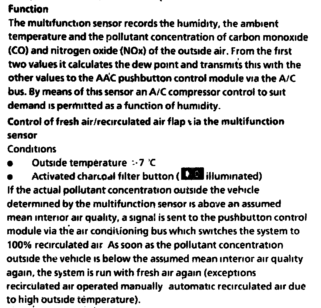 The multifunction sensor measures the humidity in the air, the ambient temperature, pollutant concentration in the outside air and controls the output of the A/C compressor, i.e; provides a control signal to the automatic A/C pushbutton control module for switching the system to 100% recirculated air when required.