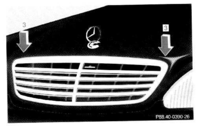Pull handle (2) to its stop out of radiator grill and open hood (do not pull up on handle).