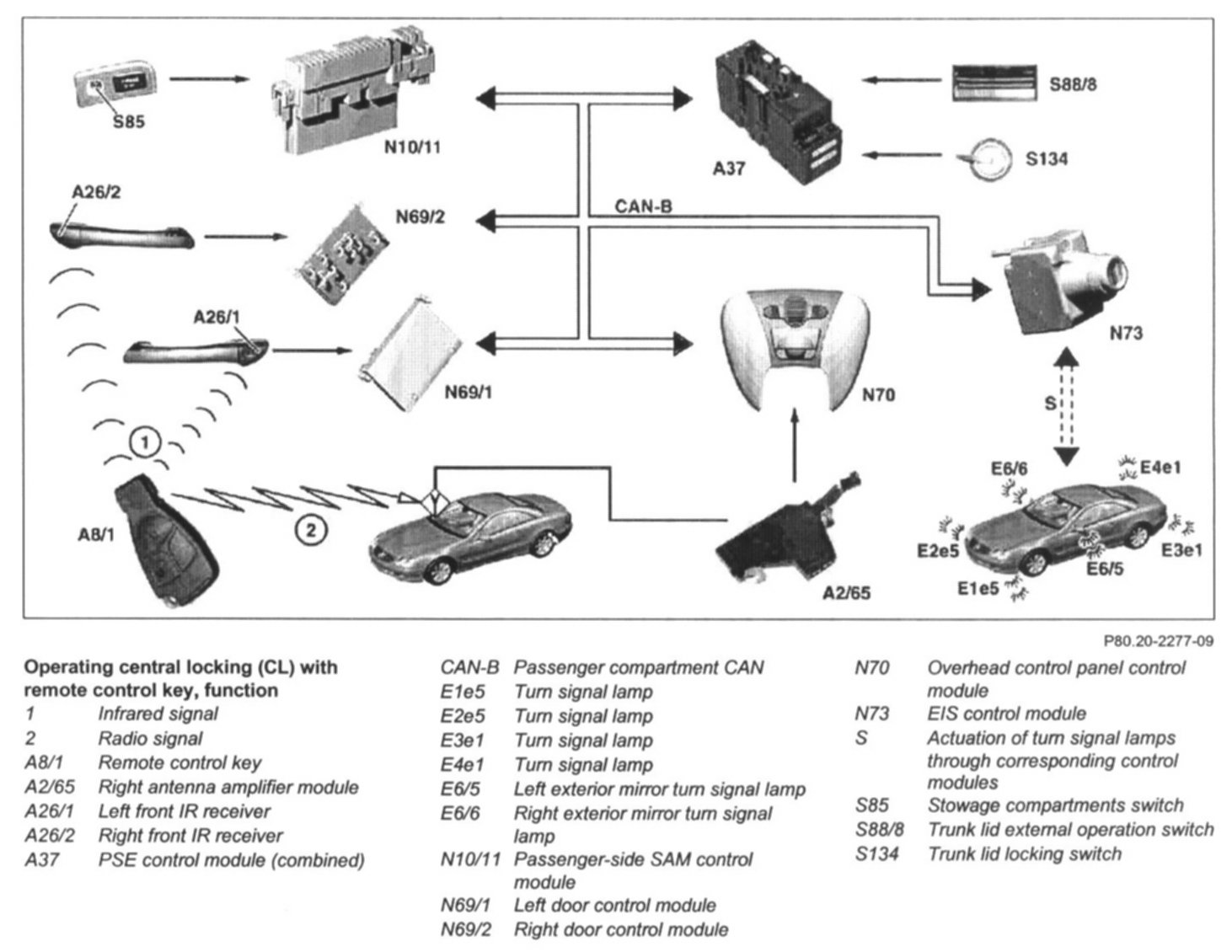 When the "Unlock vehicle" button is pressed once, the remote control key (A8/1) sends a radio and infrared signal to the relevant receivers in the vehicle. These receive the signal and transmit its content in the form of a CAN message to the EIS [EZS] control module (N73). The EIS [EZS] control module (N73) checks the access authorization. Once the access authorization is issued, the EIS control module (N73) sends the command for selective unlocking via the passenger compartment CAN.