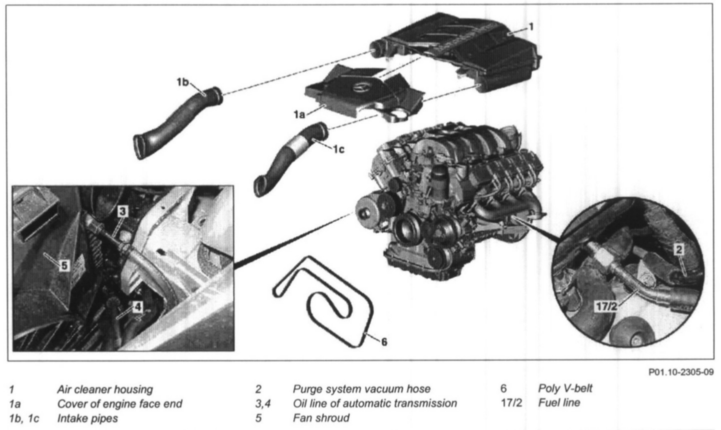 NOTE: Remove air intake pipes (1b, 1c) for this purpose and unclip cover at face end of engine (1a).