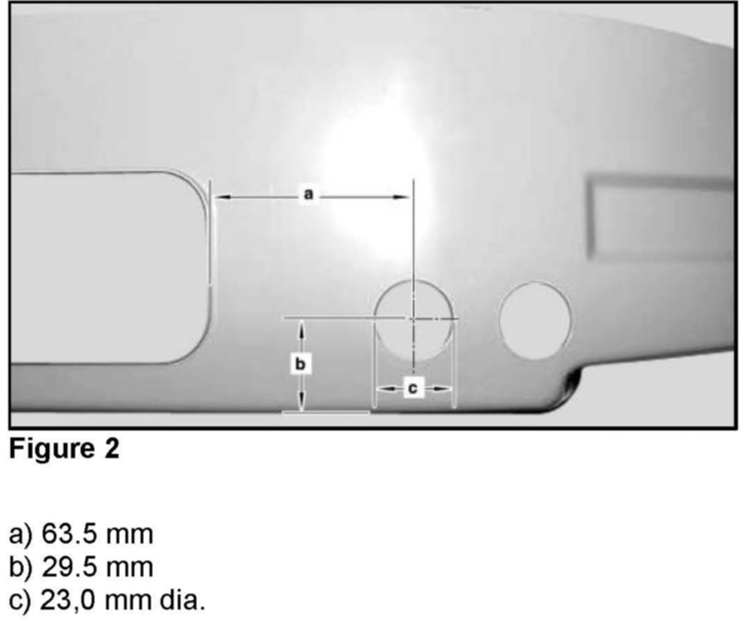 When replacing the sheet-metal part (A 230 630 01 60) on vehicles up to VIN F124253 (June 2006), the bore for the Keyless Go wiring harness must subsequently be made in the replacement part (See Figure 2 for dimensions).