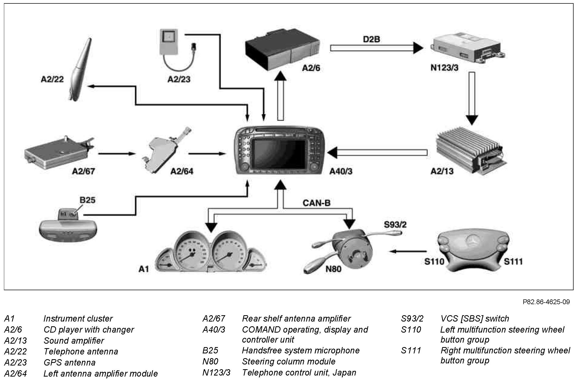 The CAN-B is used for data exchange with the instrument cluster (A1). This is how the instrument cluster (A1) receives the audio, telephone and navigation data and the time via this data bus from the COMAND operating, display and controller unit (A40/3) for the left multifunction display (A1p13).