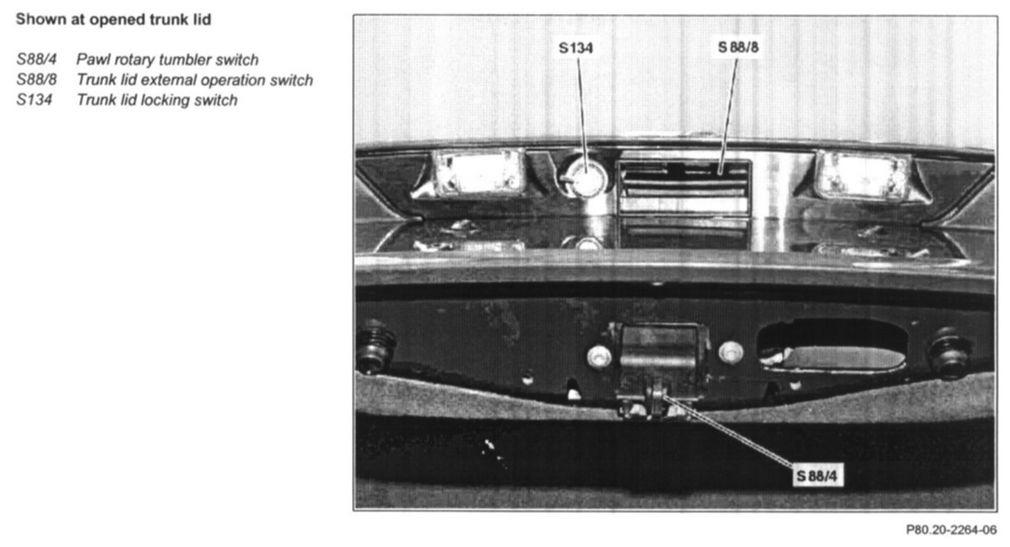 The trunk lid lock consists of three components: the lock (rotary tumbler), the lock cylinder and the trunk lid external operation switch (S88/8), which is located beside the lock cylinder. The rotary tumbler houses the pawl rotary tumbler switch (S88/4).