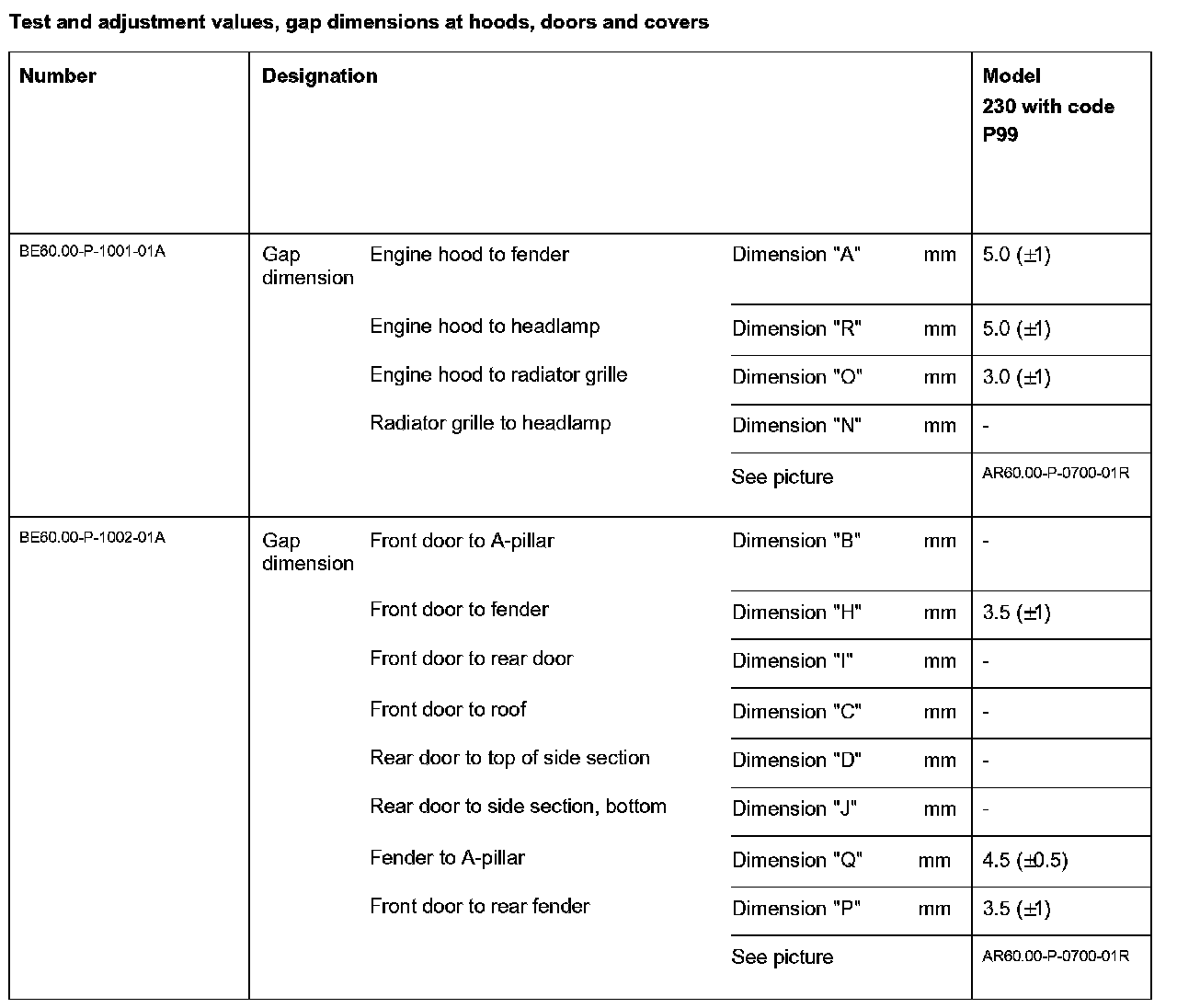 Test And Adjustment Values, Gap Dimensions At Hoods, Doors And Covers: