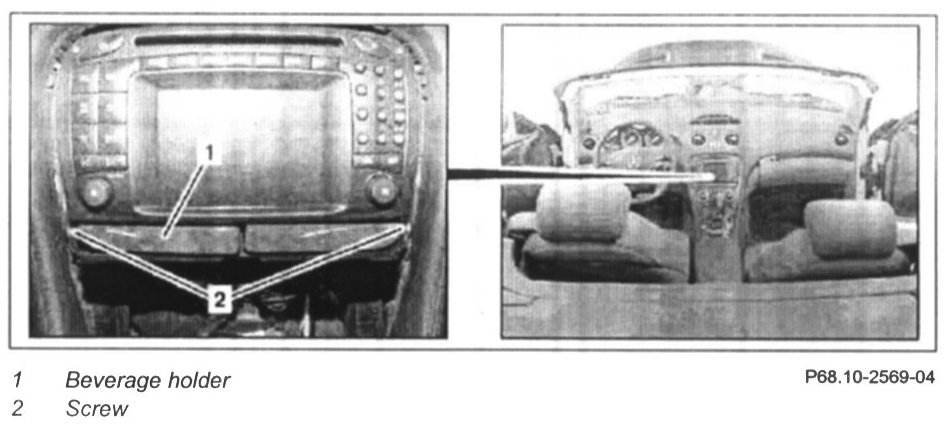 2 Unscrew screws (2) and pull beverage holder (1) out of instrument panel