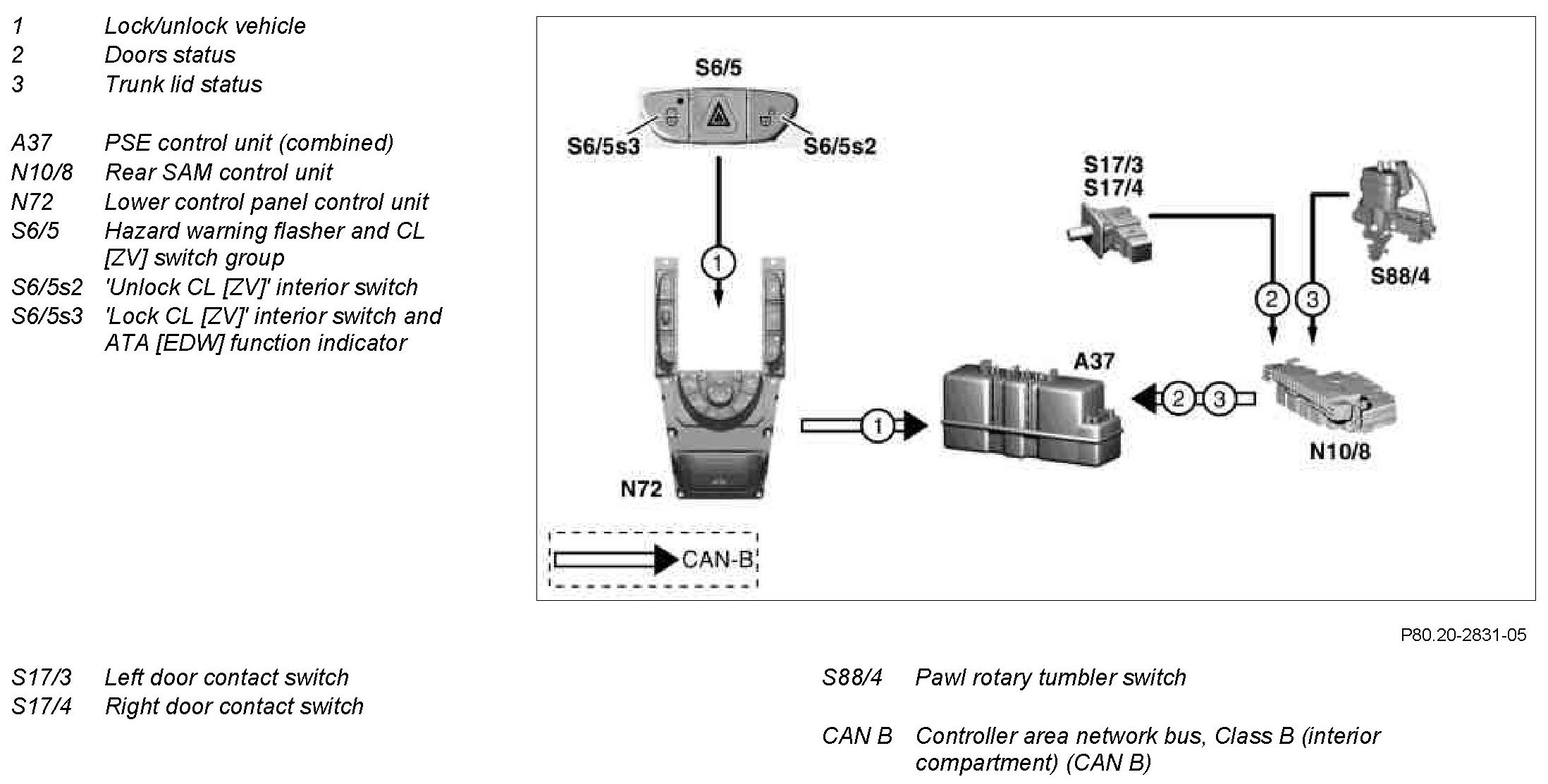 The vehicle can be unlocked with the 'unlock CL [SV]' interior switch in the hazard warning flasher and CL [SV] switch group. This does not activate or deactivate the anti-theft alarm (ATA). The signals are read out by the lower control panel control unit. The status of the doors and the trunk lid is evaluated by the rear SAM control unit via the door contact switch and the locking pawl rotary tumbler switch.