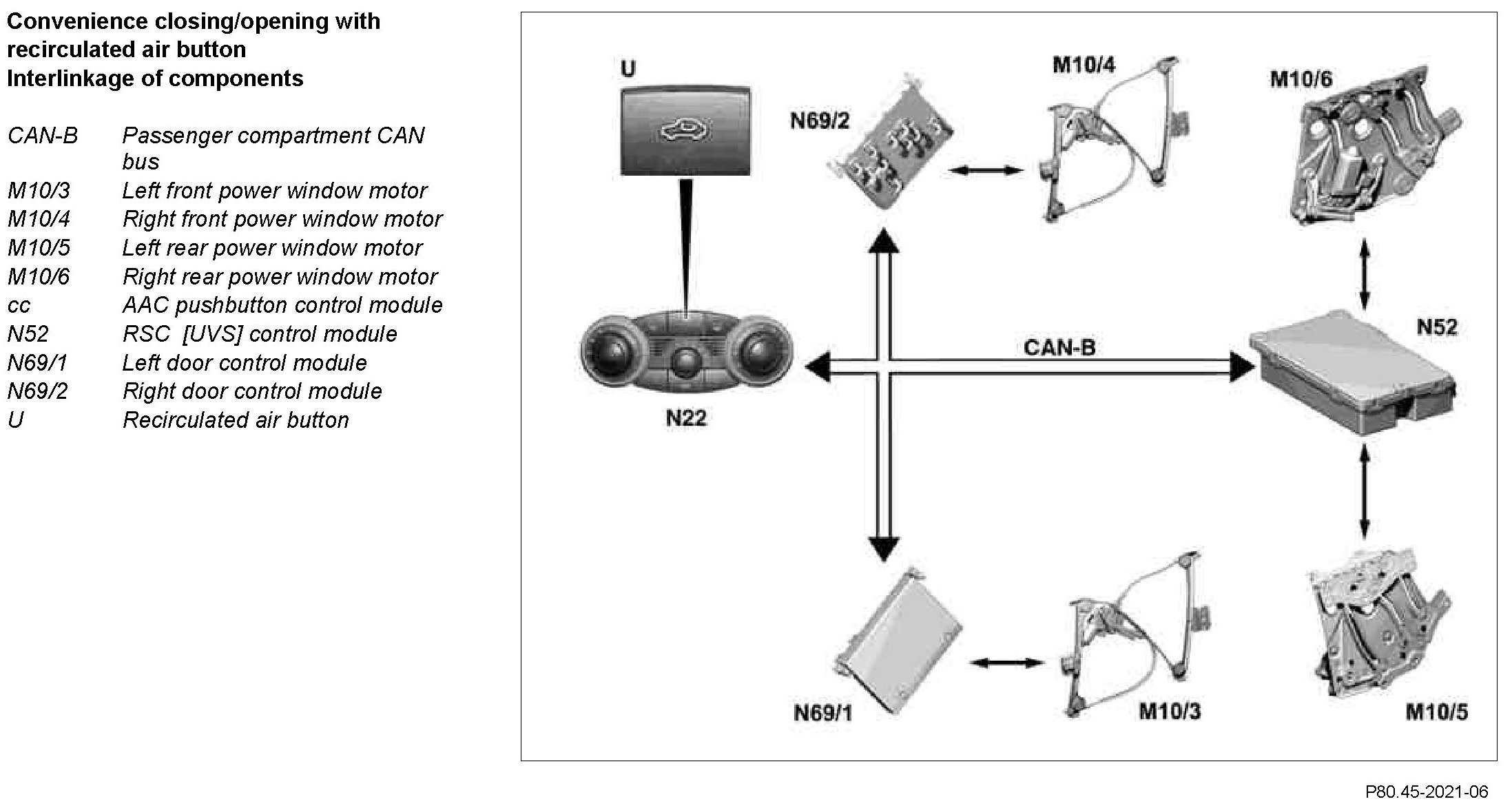 The left door control module (N69/1); the right door control module (N69/2) UVS control module (N52) and the receive the command for automatically closing the windows by the AAC pushbutton and control module (N22) via the passenger compartment CAN bus. Simultaneously the momentary window positions are stored in the corresponding control module. Then the windows are actuated for t= 80ms with time offset to avoid power surges.