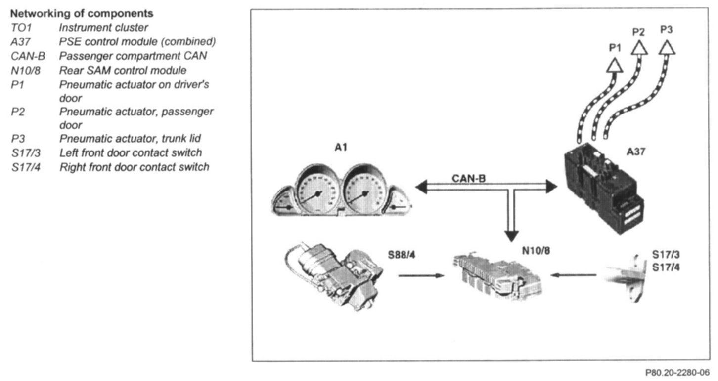 This information is supplied to the pneumatic control module with combined functions (A37) via the passenger compartment CAN and the corresponding pneumatic elements are operated. If the vehicle is unlocked with the interior CL open switch (S6/5s2) after automatic locking, the vehicle then remains unlocked even at speeds in excess of the threshold. The initial status is re-established by opening a door or by switching circuit 15 on and off again.