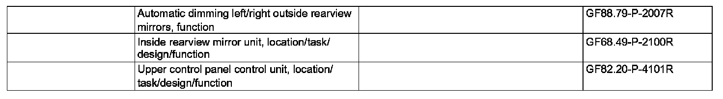 The glass of the inside rearview mirror (A67) can be electro- chromatically dimmed. The mirror glass between the reflector and the glass cover contains a layer of electrolyte gel. The light transmission ratio of this gel changes when a voltage is applied to it.
