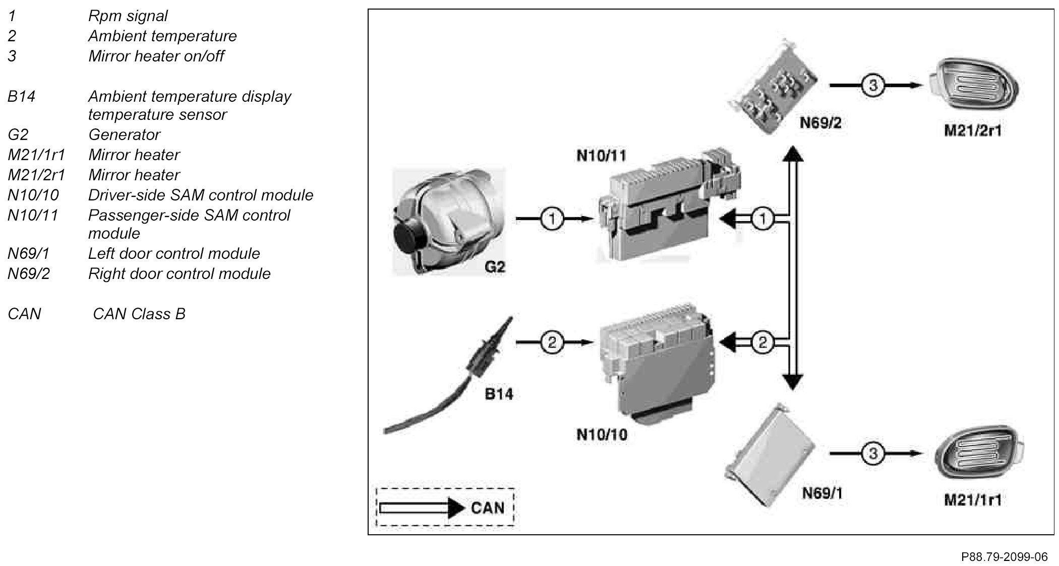 The power supply and the controlled switching on and off of the heating resistors is accomplished by the left door control module (N69/1) and right door control module (N69/2) For this purpose they receive a message by the CAN class B bus by the driver-side SAM control module (N10/10).