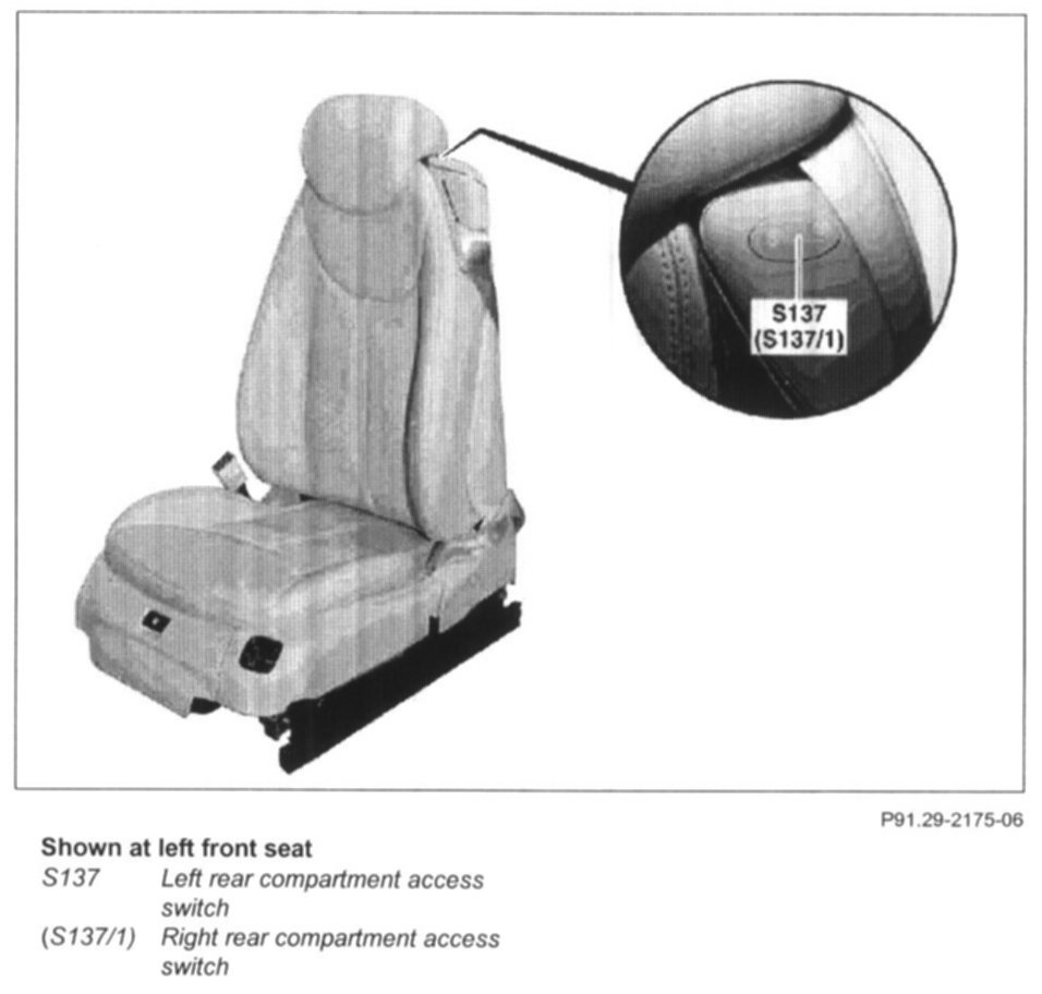 The pressed left rear compartment access switch (S137) is read in by the left front seat adjustment with memory control module (N32/1)