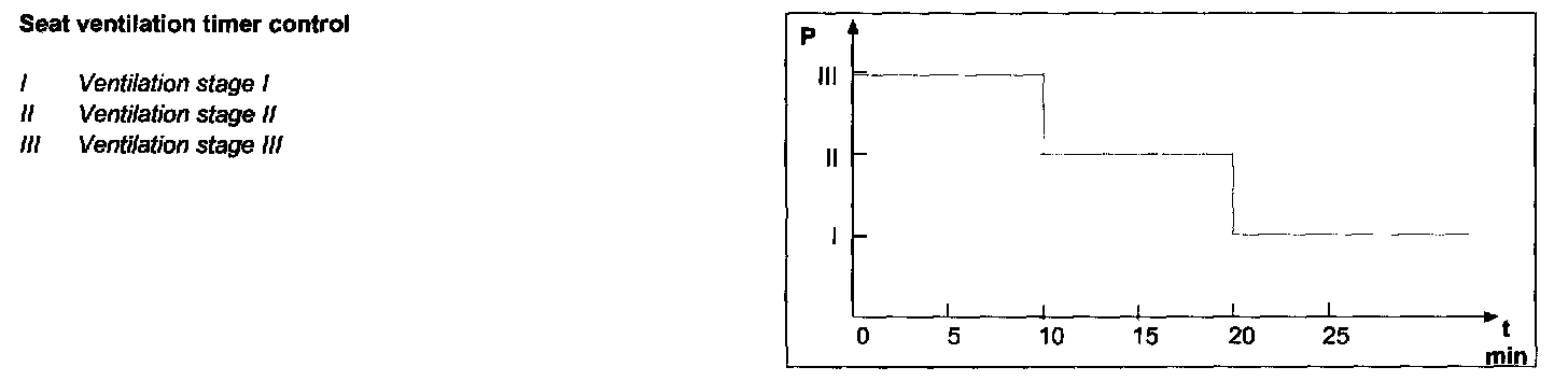 The seat ventilation has three ventilation stages. During normal operation, stage III of the seat ventilation is automatic after 10 min at stage II, and after a further 10 min is switched back to stage I 10 minutes later.