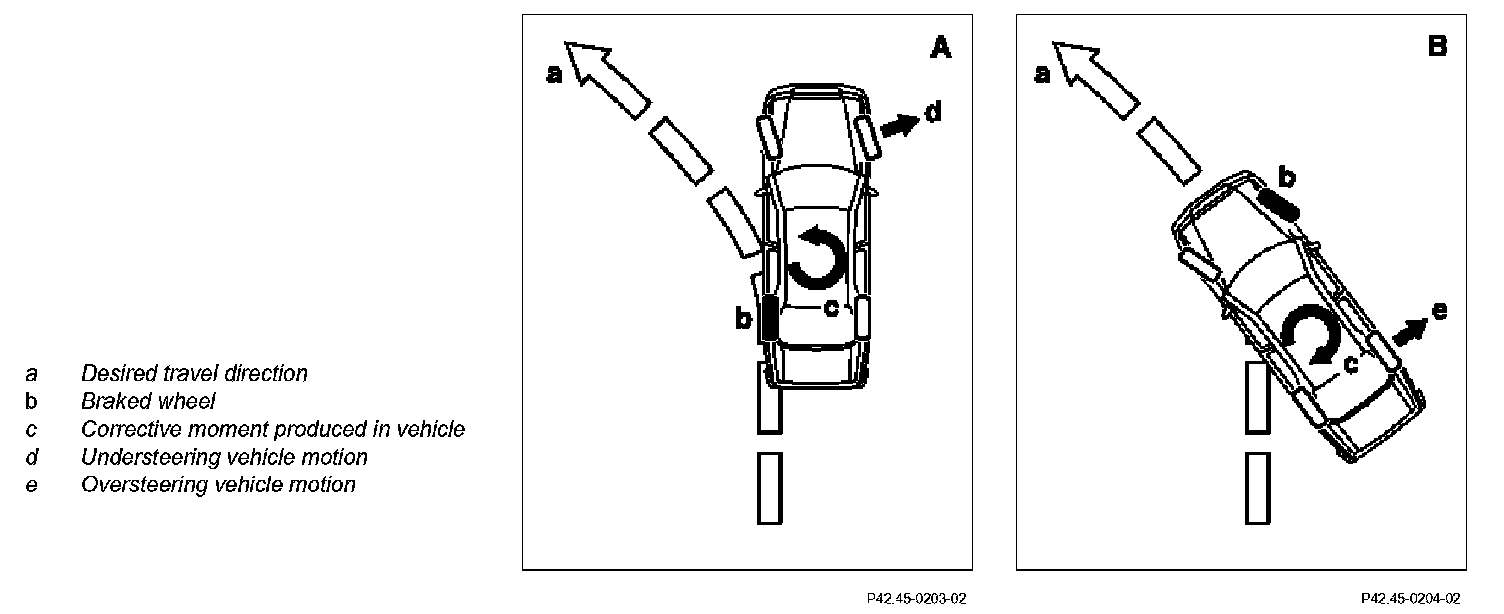 ESP prevents the vehicle from breaking away when over steering or under steering. In all situations it ensures that the vehicle does not deviate from the course specified by the driver (within the bounds of physical limits). Brake forces are produced selectively at the individual wheels to correct this.