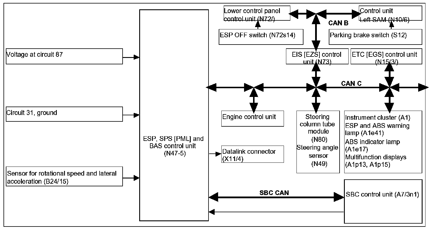 In the ESP, SPS [PML] and BAS control unit (N47-5) the signals of the wheel speeds, the steering angle, the rotational speed of the vehicle, the lateral acceleration as well as the brake pressures of the individual wheels are recorded and processed by a drive status regulator. After evaluating the input signals the required solenoid valves are actuated via the SBC control unit in order to regulate the brake pressure in the individual wheel brakes.