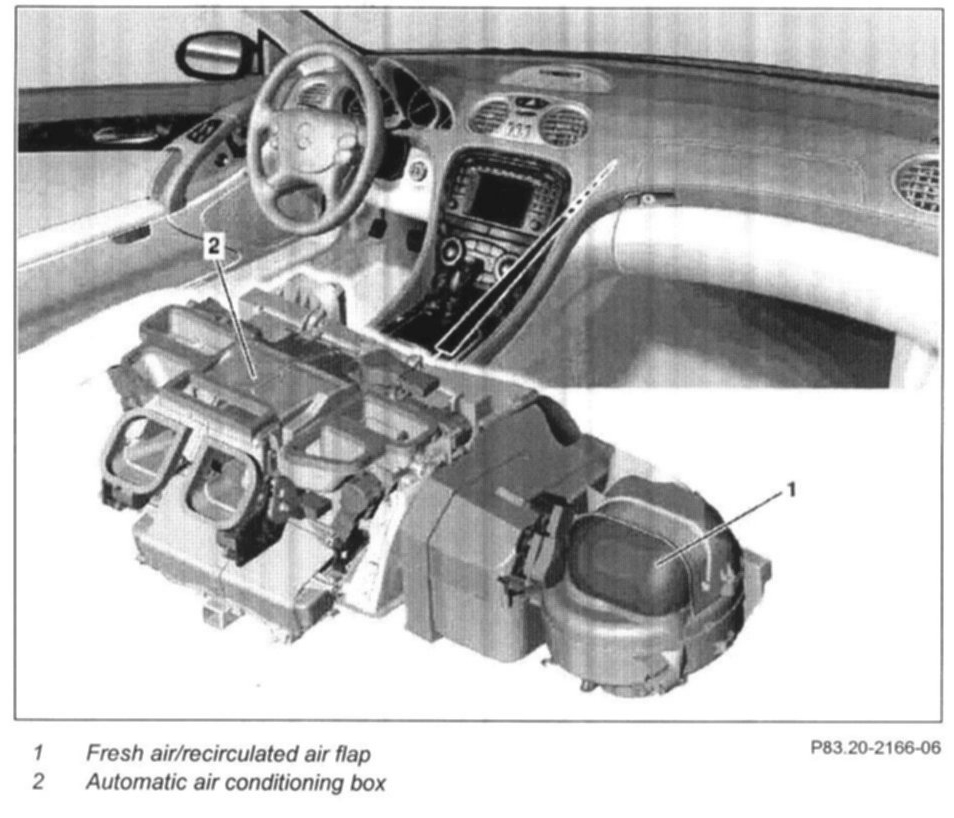 The fresh air/recirculated air flap (1) is located to the right of the automatic air-conditioning box (2).
