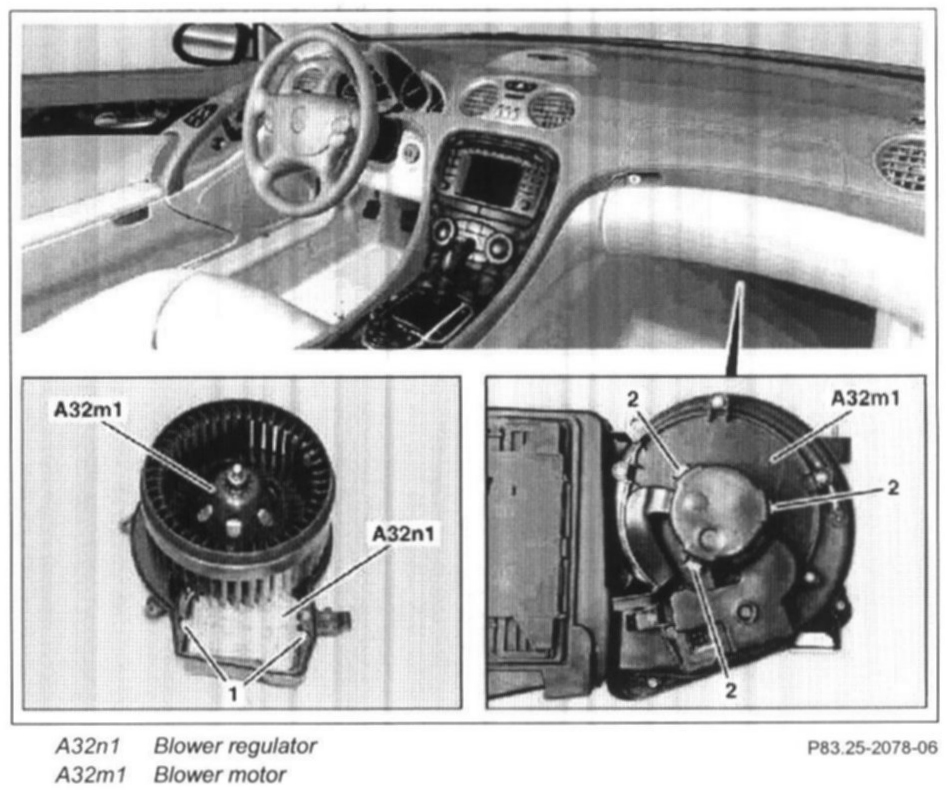 The blower regulator (A32n1) is located below the glove compartment at the right of the automatic air-conditioner box and is mounted to the blower motor (A32m1).