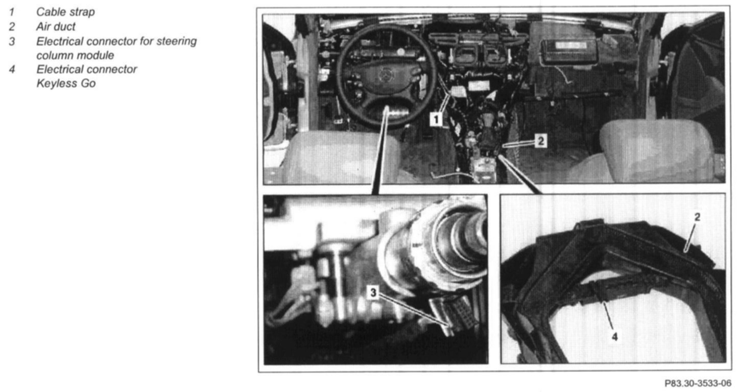 6 Detach electrical connector (4) for Keyless Go at air duct (2)