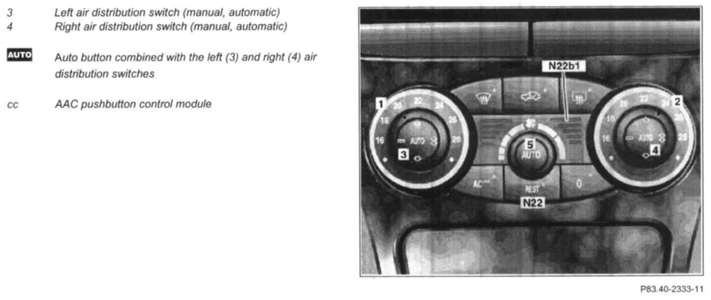 The left (3) and right (4) air distribution switches are located on the right of the AAC pushbutton control module (N22).