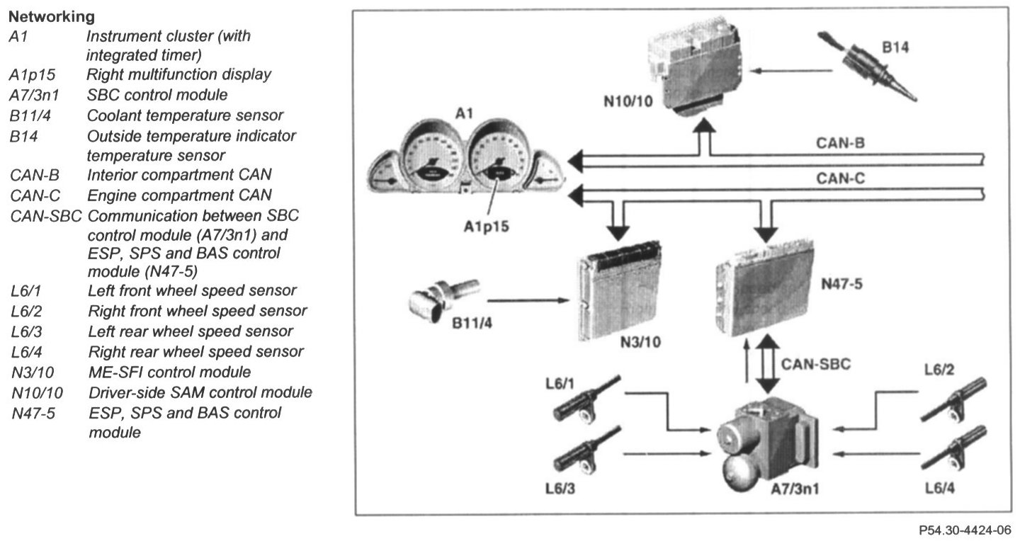 - The SBC control module (A7/3n1) relays the four wheel speed signals onto the engine compartment CAN via the ESP, SPS and BAS control module (N47-5).