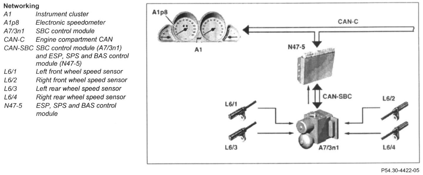 - The instrument cluster (A1) receives the wheel speeds in rpm over the engine compartment CAN from the ESP, SPS and BAS control module (N47-5).