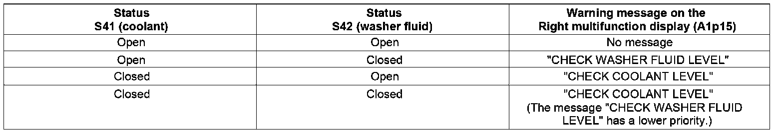 The coolant level indicator switch (S41) and switch for level check of windshield washer system (S42) are connected in series. Both switches are read in by the front passenger SAM control unit (N10/11) via two lines.