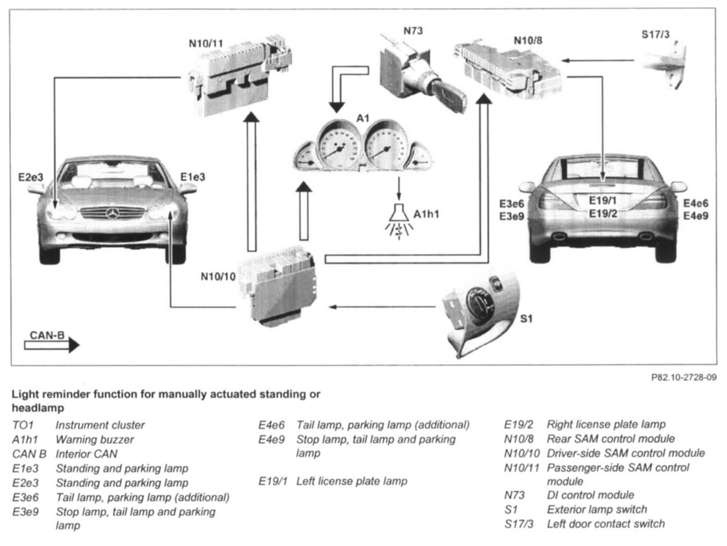 - The rear SAM control module (N10/8) recognizes the open door from the left door contact switch signal (S17/3) and transmits the signals "Door open" to the instrument cluster.