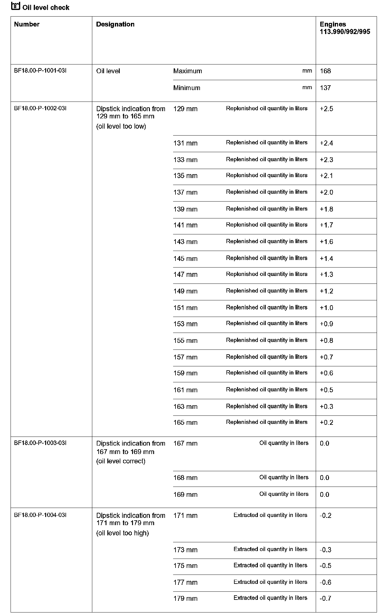4 Determine replenished oil quantity using oil level table.