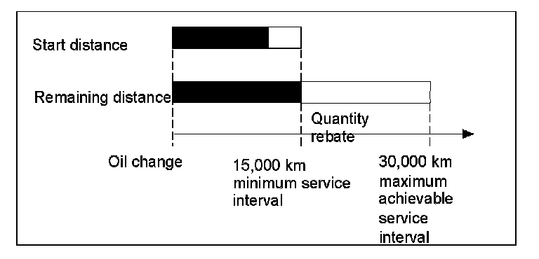 By means of an appropriate quantity rebate (favorable evaluation of driving distances or due to oil refills), the entire remaining distance and therefore the service interval can be increased to a maximum of twice the starting distance, in this case 30,000 km or 20,000 miles (white section).