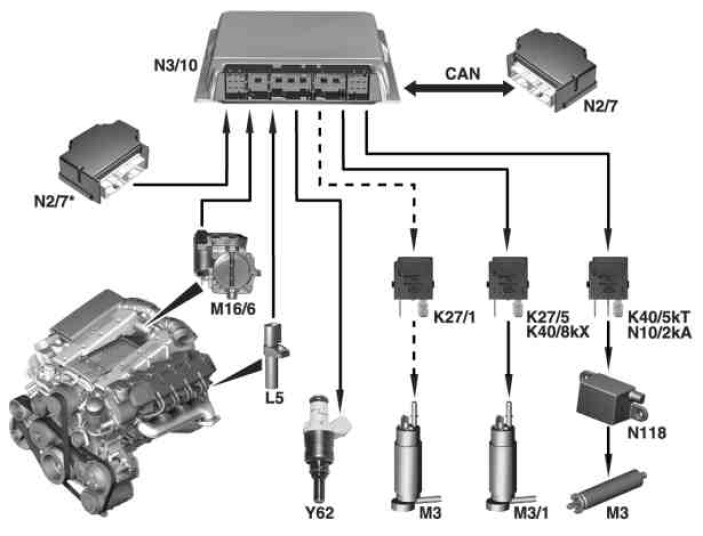 ^ When receiving a crash signal (from the restraint systems control unit) accompanied by triggering of airbags ->The ME control unit switches off the fuel pump and actuates the fuel injection valves shortly in order to depressurize the fuel system.