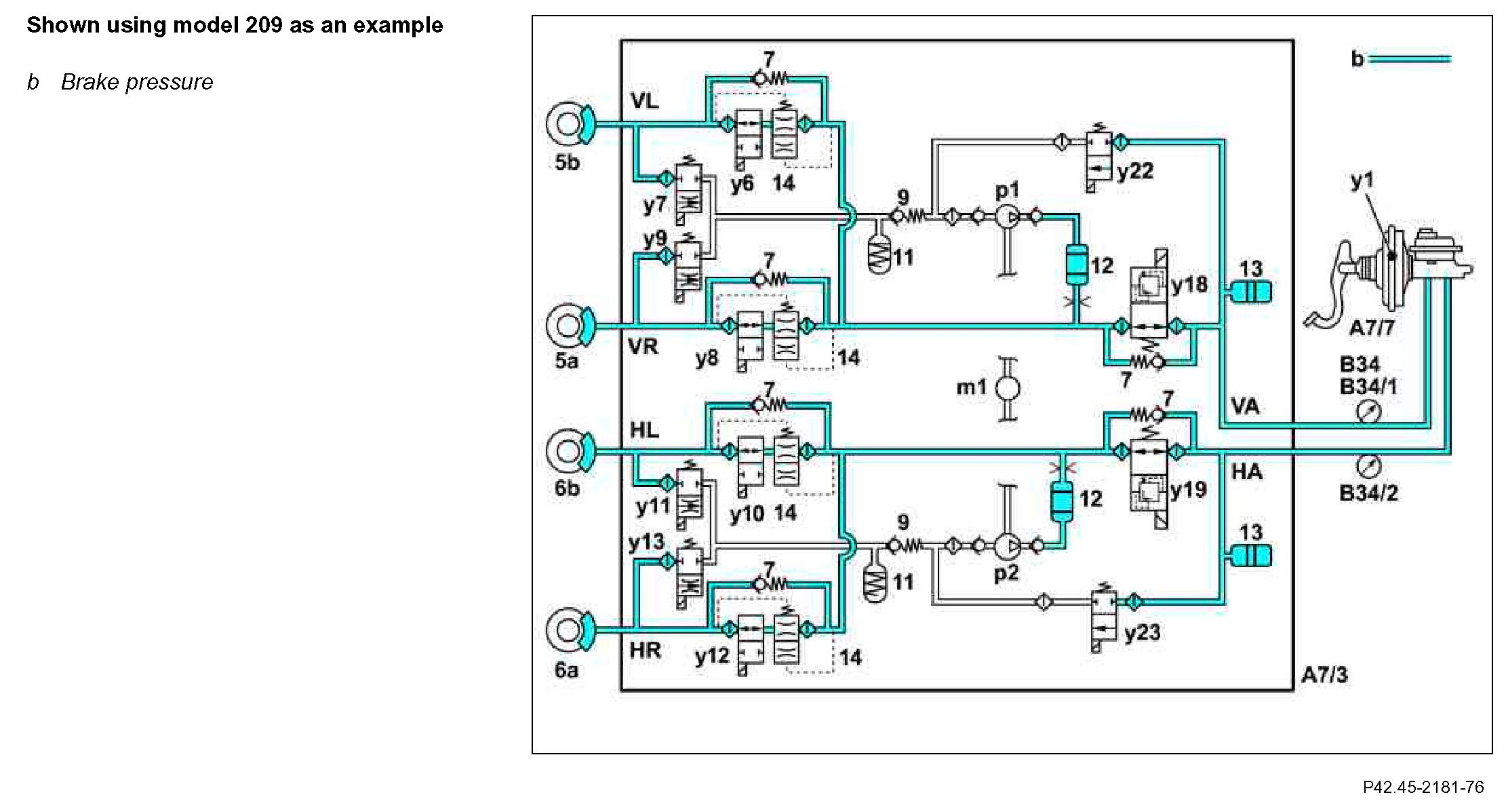 The brake pressure is built up via the two change-over solenoid valves (y18 and y19) and the solenoid valves (y6, y8, y10 and y12).