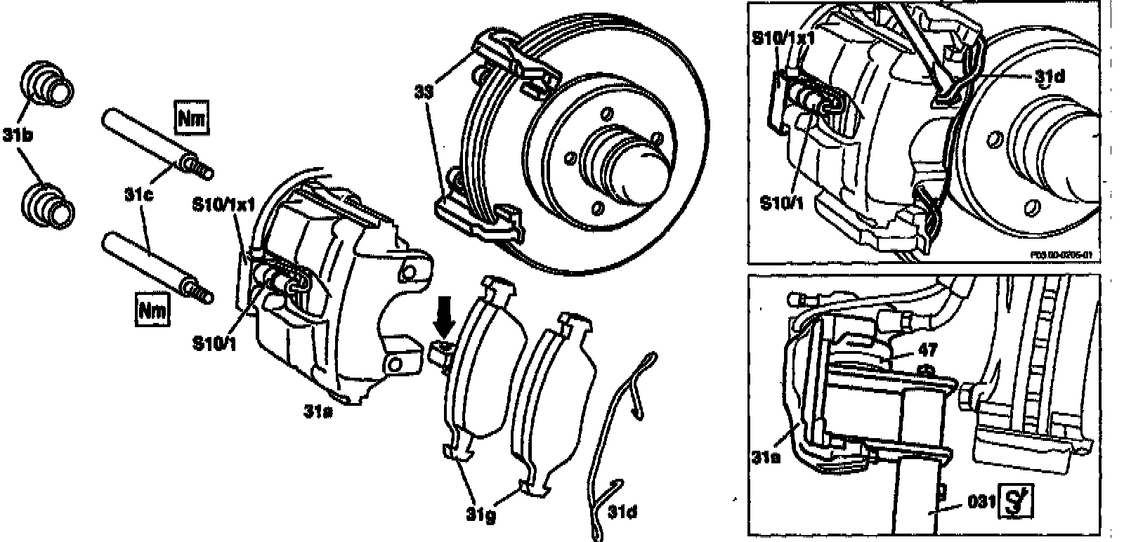 - Always install front brake pad wear sensor (S10/1) on inner brake pad.