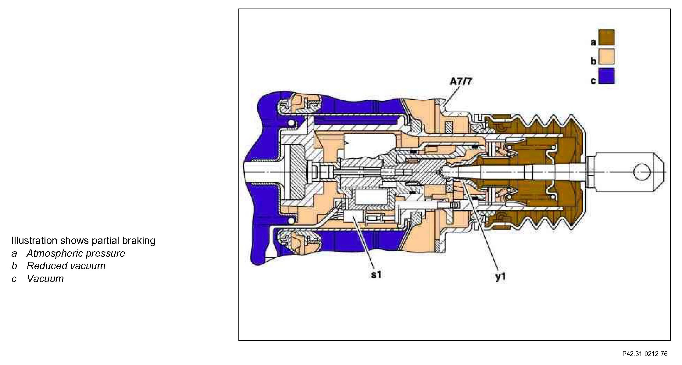 The BAS brake booster (A7/7) is supplied continuously via the vacuum line with intake manifold vacuum or pump vacuum on diesel models. If the brake is not actuated, equal vacuum exists on both sides of the diaphragms. The compression spring holds the diaphragm disks in their starting positions.