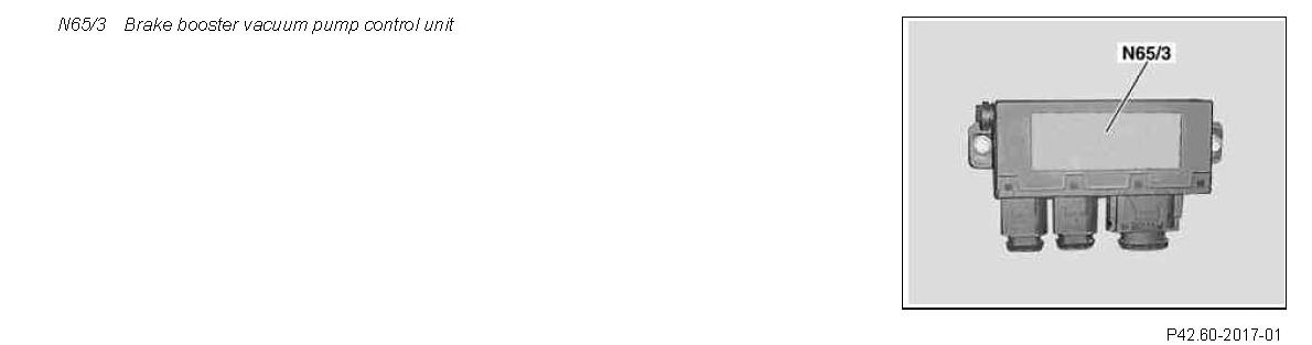 When the brake is pressed the stop lamp switch signal is passed on to the brake booster vacuum pump control unit (on the gasoline engine by the CAN data bus via the ESP control unit). The brake booster vacuum pump is actuated when the vacuum measured by an internal sensor is < 500 mbar.