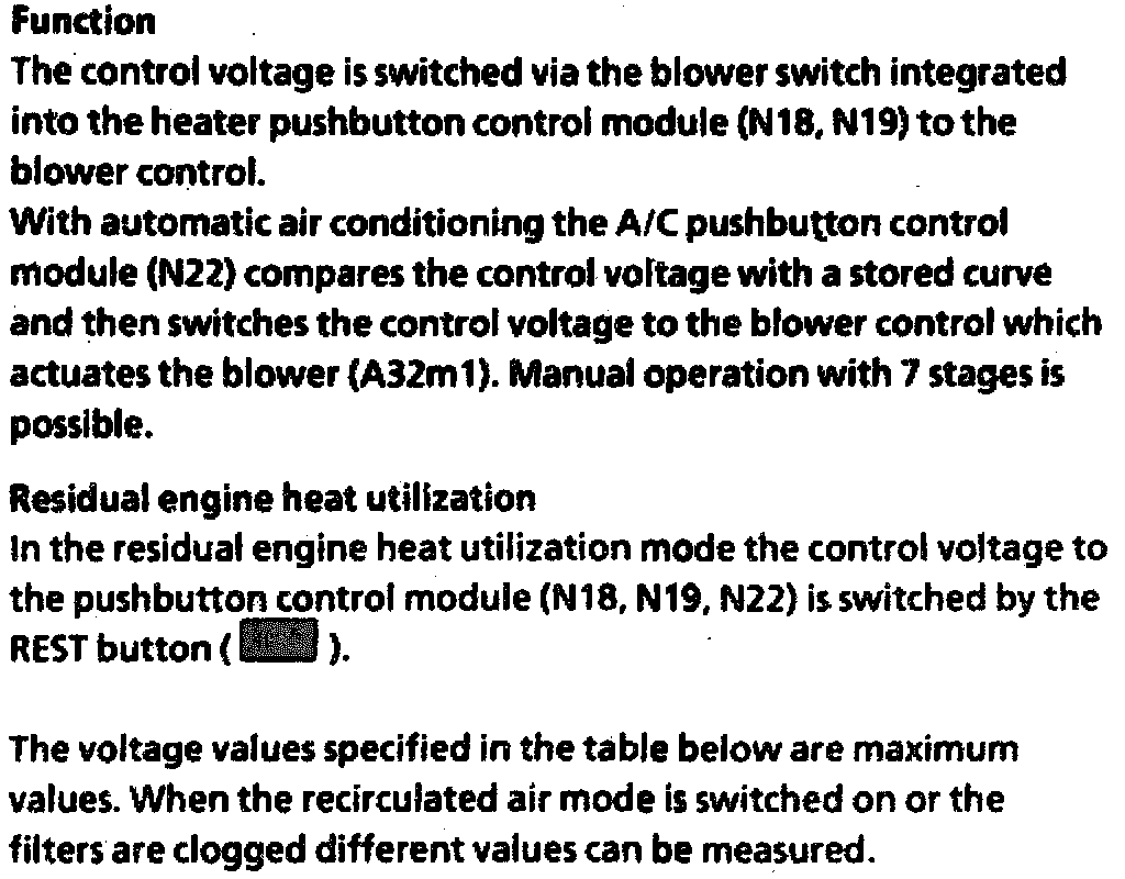 In the fresh air mode the blower (A32m1) sucks fresh air in through the fresh air flap; in the recirculated air mode air is sucked through the recirculated air flap from the vehicle passenger compartment into the heater or air conditioning housing. In the residual engine heat utilization mode the blower (A32m1) circulates the air in the passenger compartment.