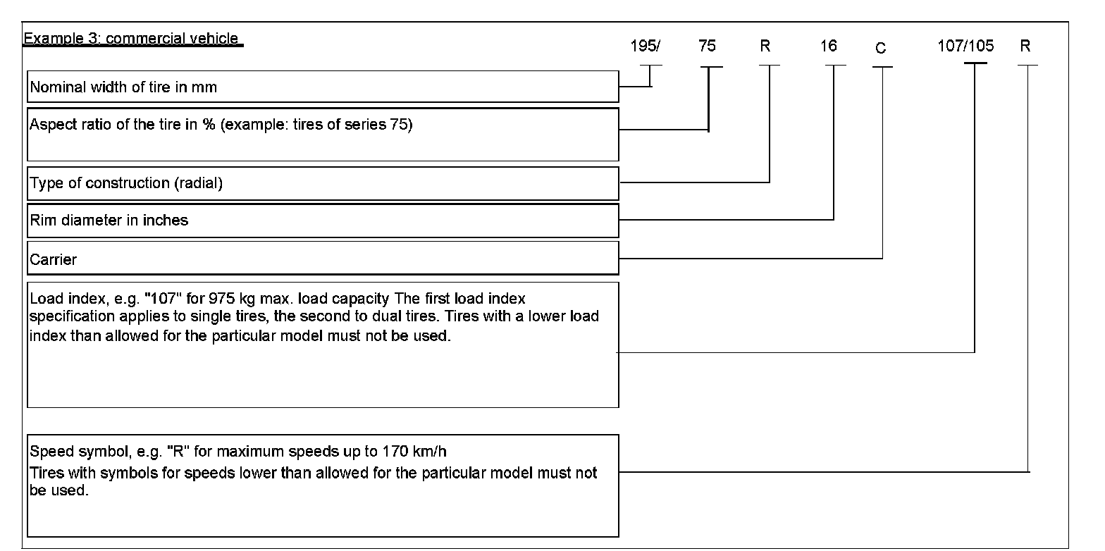 For the designation of tires as per ECE directive, with the exception of ZR tires (see example 2), the speed symbol for the permissible maximum speed is specified after the tire size.