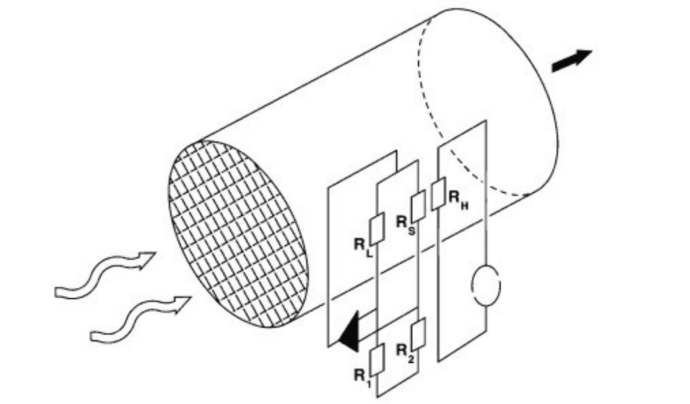 The electronics in the hot film mass air flow sensor control the temperature of the heating resistor (RH) by means of a variable voltage so that its temperature is 160°C above the intake air temperature detected by the temperature resistor (RL).