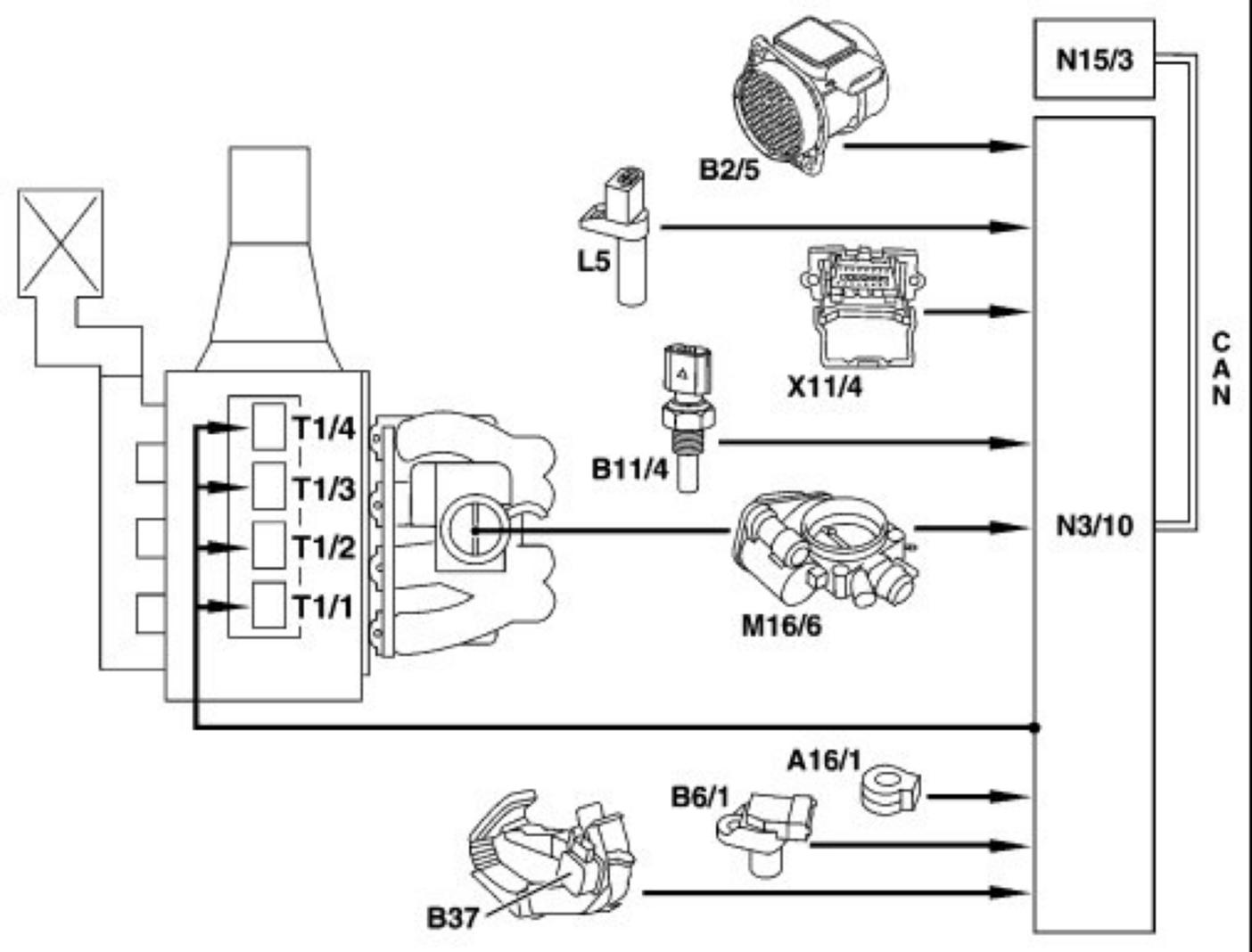 Basic diagram of ignition system with rotorless high voltage distribution engine 111 EURO 3