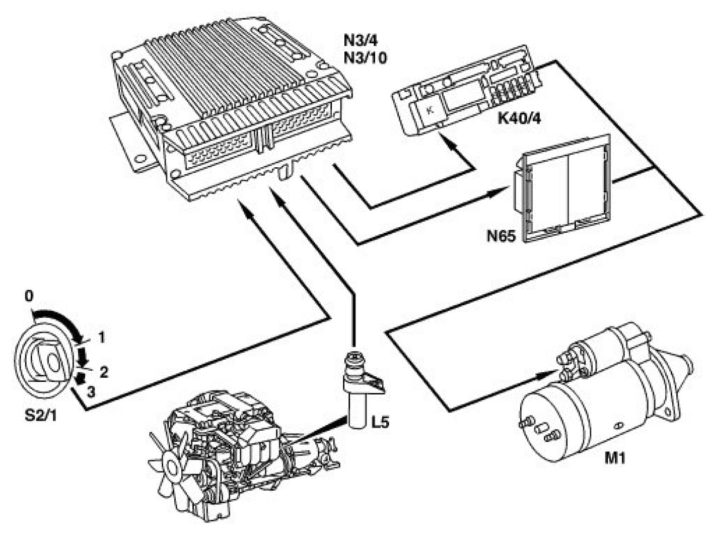 When the ignition/start switch is turned from position 2 into the start position, start recognition is activated by the engine control unit through circuit 50. As soon as an engine start speed of 400 to 700 rpm is reached, the engine control unit interrupts the ground actuation to the starter relay and thus the start operation.