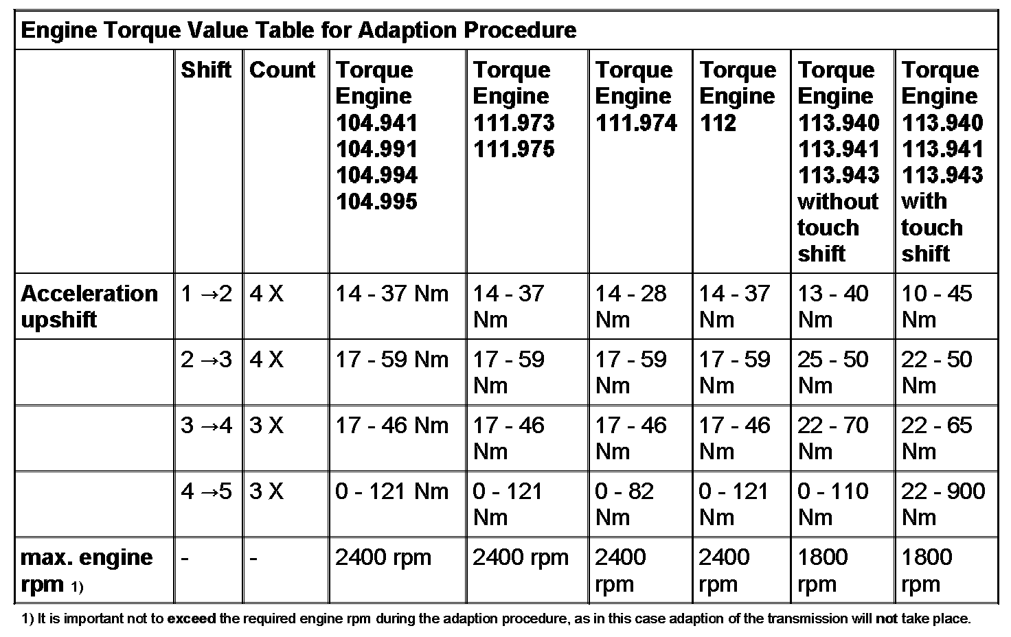 1. Following the replacement/swap or repair of a transmission, the following shifts must be newly adapted after resetting the values: