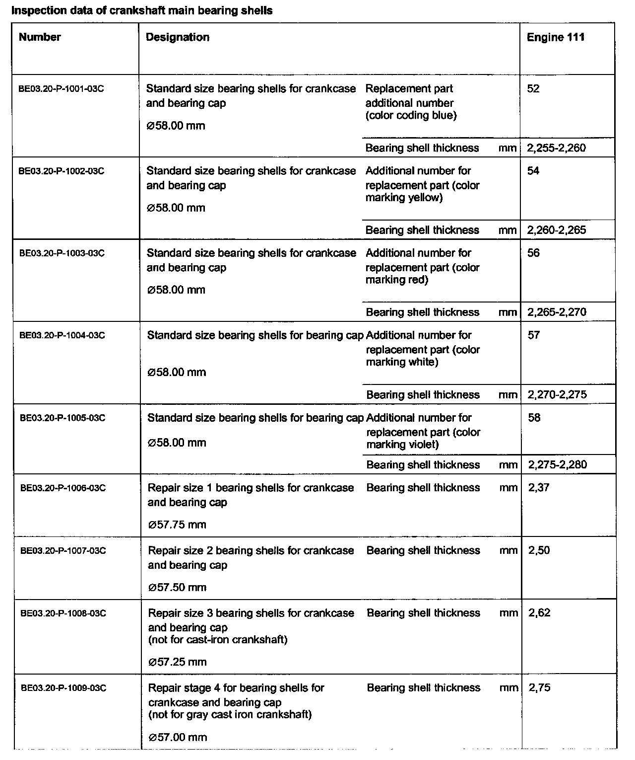 Inspection Data Of Crankshaft Main Bearing Shells: