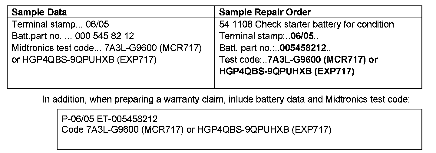 1. When testing the battery, the battery test devices "Midtronics EXP717" or "Midtronics MCR717" (Version 2.0)" must be used. For additional information including application of Midtronics test equipment see: AR54.10-P-1129**.
