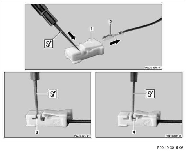 15 Attach blade holder with clamping pliers and MQS blade from above through opening (3) of connector housing (1), press down spring shackle of female contact (2), and pull female contact (2) out of contact cavity of connector housing (1) to end stop.