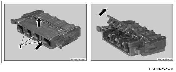 1 Using a suitable tool, at the line side unlock the lugs (1) on lock tab.