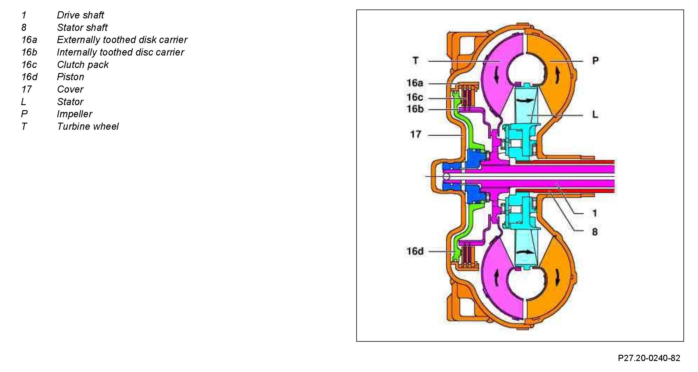When actuated by the ETC control module (N15/3), oil pressure controlled by the torque converter lockup PWM solenoid valve (Y3/6y6) is directed through the input shaft (1) to the pressure chamber behind the piston (16d). The piston presses the clutch pack (16c) together and allows torque to be transferred directly between the impeller (P) and turbine wheel "P"