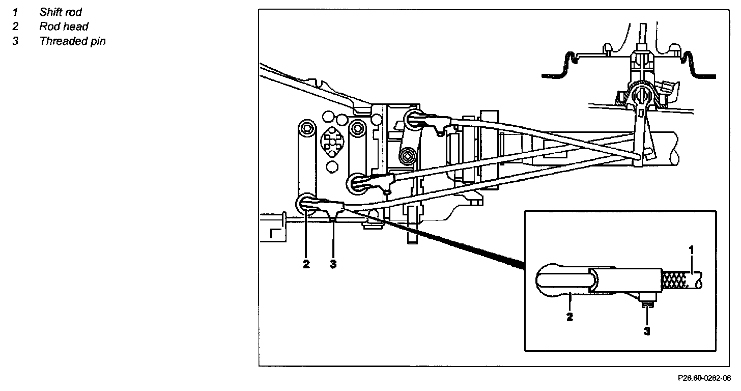 6 Move the transmission shift lever into the center position and engage, inserting the end of the shift rod in the rod head (2).