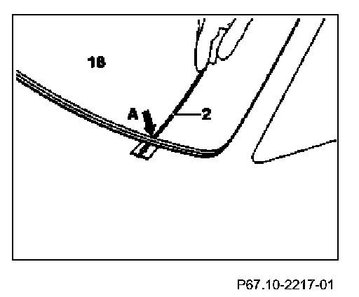 1. Mask off puncture point at position (A) (arrow) from outside with suitable textile adhesive tape and punch from vehicle interior through adhesive seam of window (18) with awl (2).